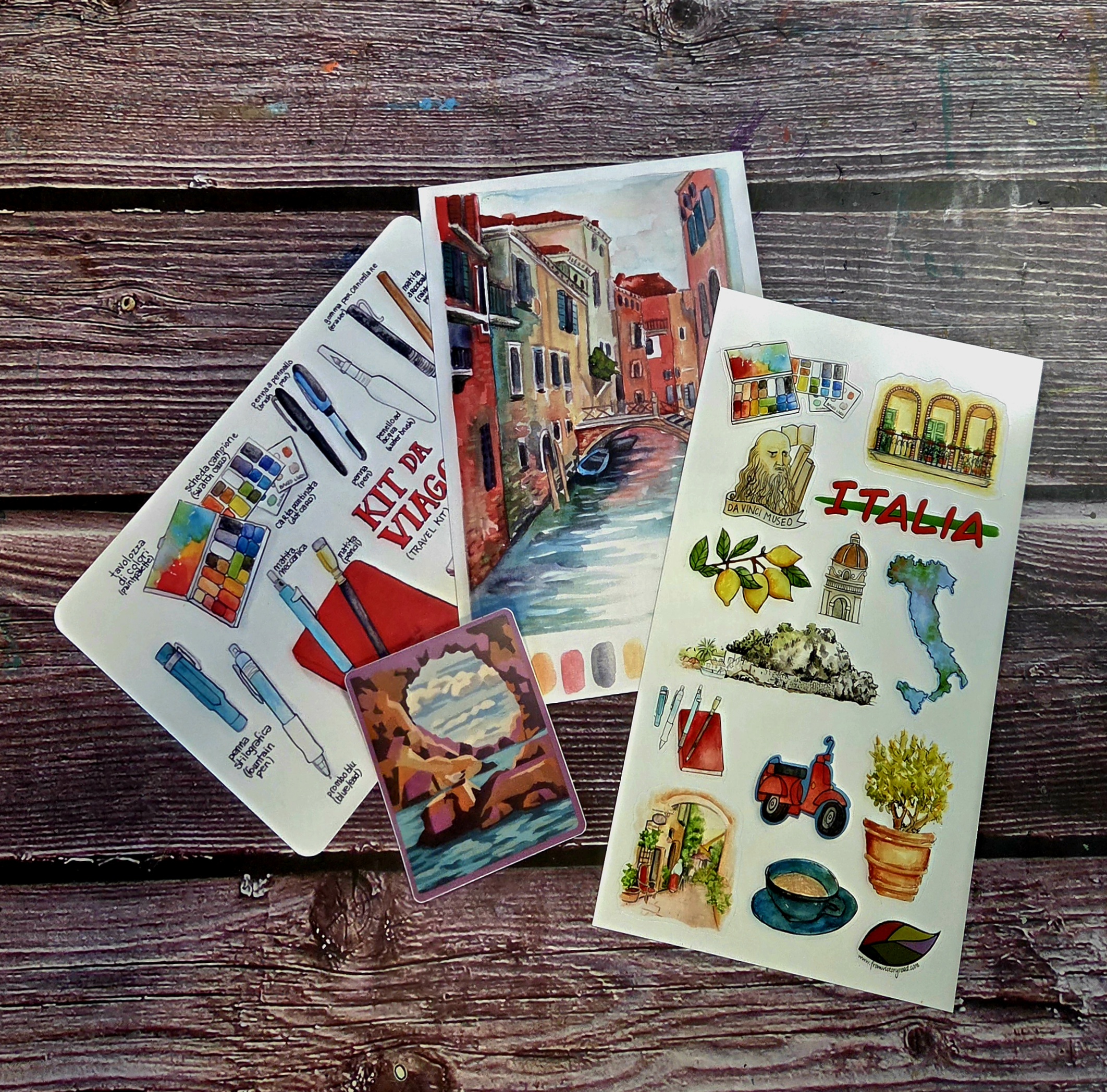 This gift pack includes art print postcards, a vinyl sticker, and a sticker sheet of elements from the pages of my journal.