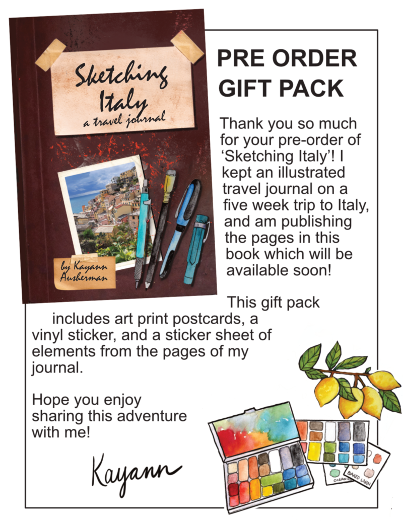 This is a pre order for my soon to be released ‘Sketching Italy’ published from travel journals that I kept on an epic 5 week trip through Italy. It includes on the go illustrations and hand written observations, as well as tips for keeping your own travel journal. This would also be a great gift for any traveler in your life.